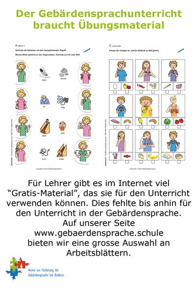 Lernen bedeutet üben. Deshalb haben wir aus den Gebärdenbildern, die wir für unsere Bücher zeichneten Gebärdensprach-Arbeitsblätter entwickelt. Diese bieten wir auf unsere speziellen Webseite kostenlos an.