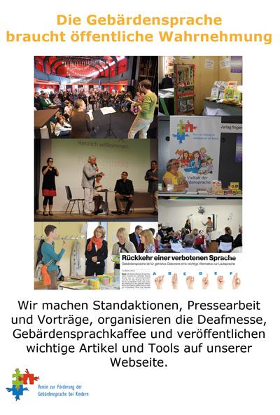 Für die Anerkennung der Gebärdensprache ist Öffentlichkeitsarbeit sehr wichtig. Wir engagieren uns in der Pressearbeit, bei Vorträgen aber auch mit Informationsständen. In Basel bieten wir auch eine spezielle Deafmesse an.